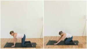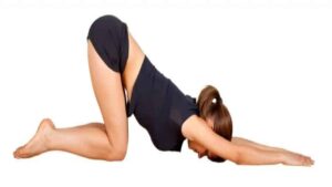 This second trimester pregnancy yoga pose works in stretching the lower back while supporting the upper body weight.